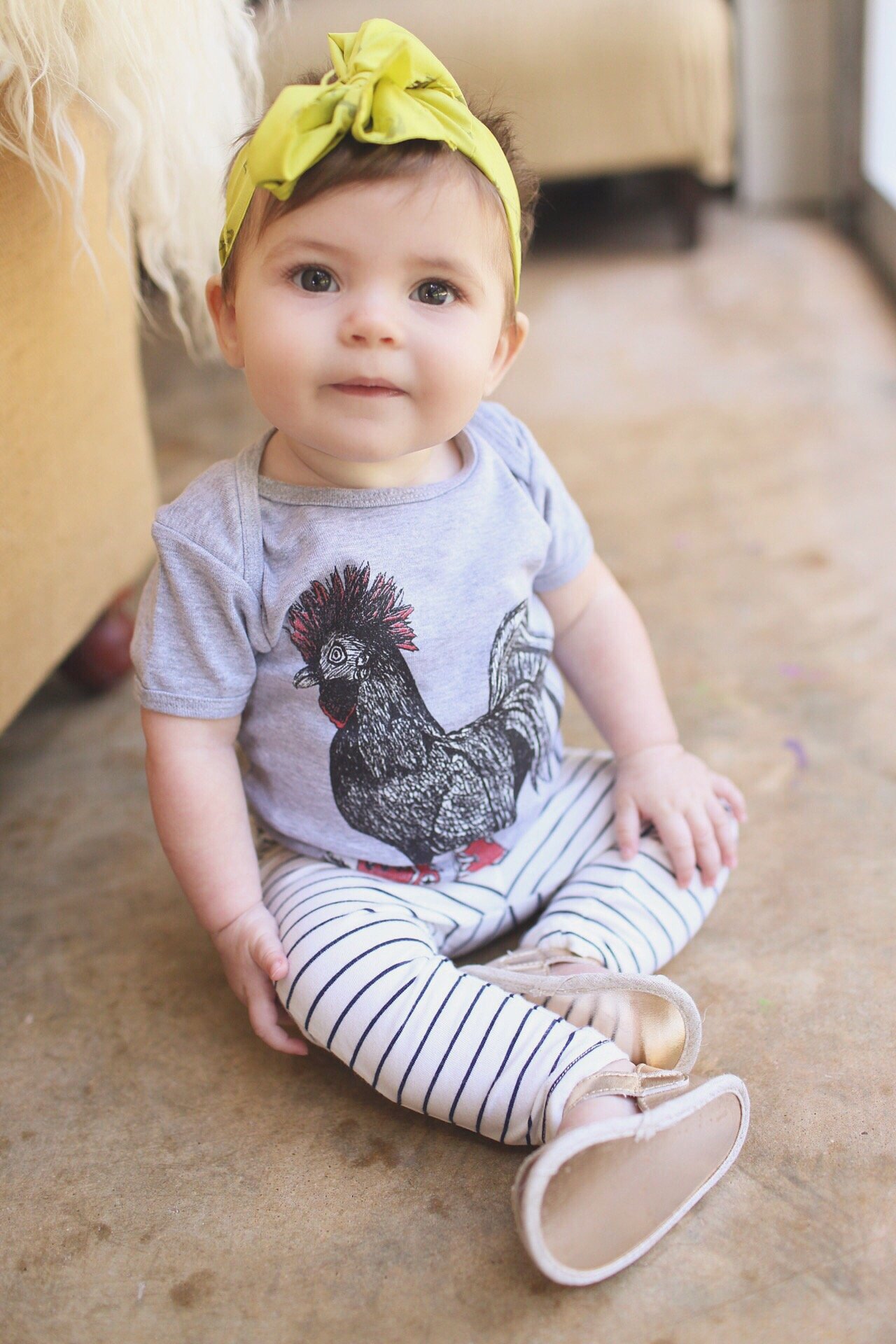 Our newest baby onesie featured our Cluck Taylor design in red, white and black on a super soft heather gray short sleeve onesies. Made in the USA. Designed and printed in Louisiana. 3-6 month, 6-12 month. $23.